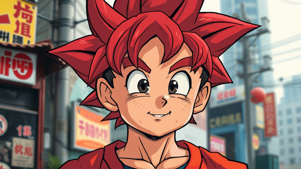 Portrait of Goku in the style of a street art aesthetic, blending cute cartoonish designs with photo-realistic techniques, dark red hues highlighting a nostalgic childhood arcadia. Anime aesthetic merges with cartoon-like figures, capturing a playful yet detailed essence of Goku's world. Goku's features are exaggerated in a whimsical way, preserving his iconic look within an imaginative and vibrant urban backdrop.