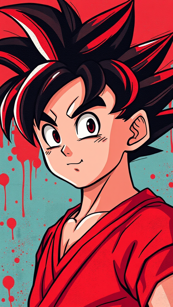 Portrait of Goku in the style of street art aesthetic, featuring cute cartoonish designs with photo-realistic techniques, dark red tones, evoking childhood arcadias and anime aesthetics, with cartoon-like figures, highlighting vibrant graffiti elements and playful, nostalgic charm.