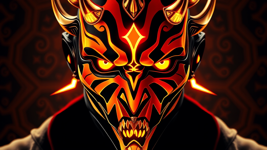 Portrait of golden and black Darth Maul, Star Wars, sci-fi theme, glowing illumination, symmetrical design, intricate and elegant details, highly detailed, photography-inspired, artstation style.