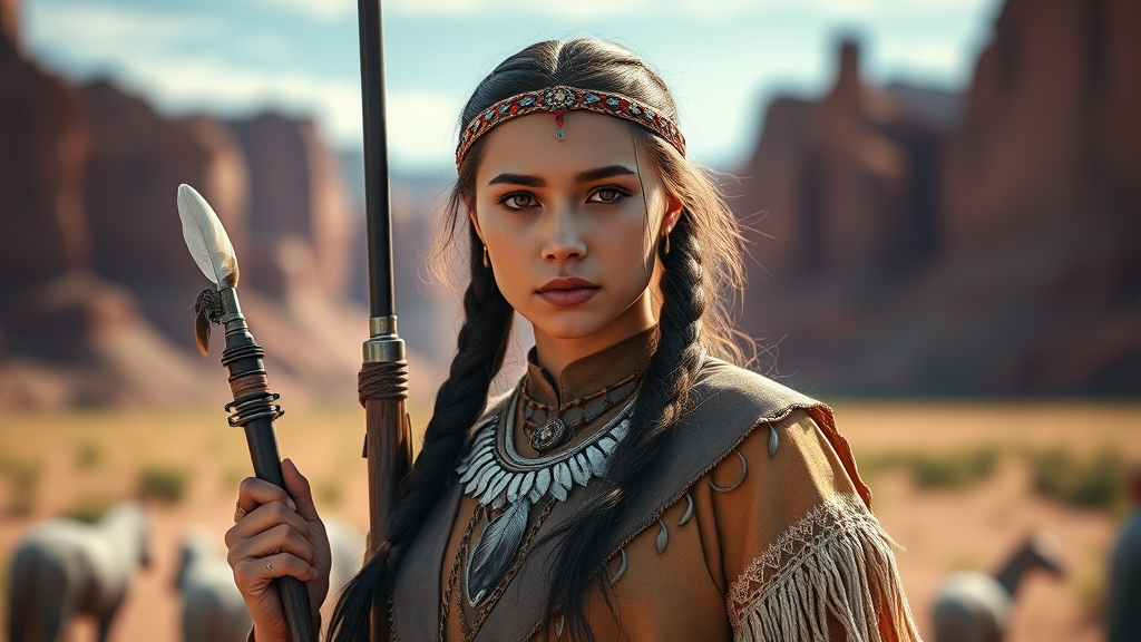 Portrait of Madison Beer as Pocahontas, a young beautiful Native American woman with a perfectly symmetrical face, adorned with feather jewelry and wearing a traditional handmade dress. She stands as an armed female hunter and warrior in a Utah landscape, captured in ultra-realistic concept art style. The scene is elegant with a depth of field effect. The image is 8k resolution, focusing on intricate details while avoiding any digital artifacts or anatomical errors. The composition is both striking and graceful, emphasizing natural beauty and strength without distractions.
