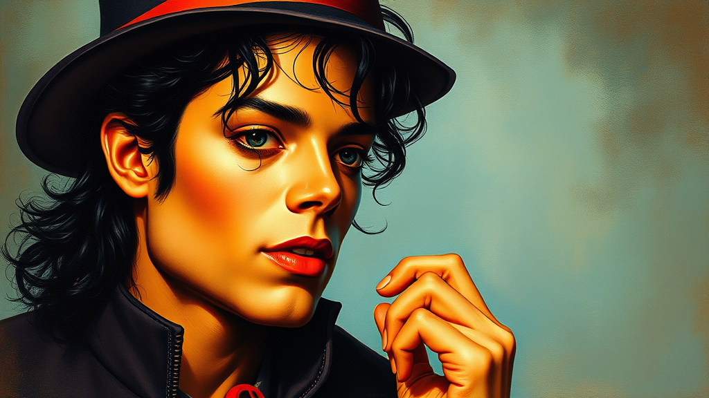 Portrait of Michael Jackson, a harmonious blend of fantasy and realism by an artist inspired by Michael Whelan, Rossetti, and Bouguereau, with a touch of Artgerm's dynamic stylization; rendered in a retro, nostalgic style reminiscent of classic poster art, evoking an old-fashioned charm with subtle creative twists on iconic elements.