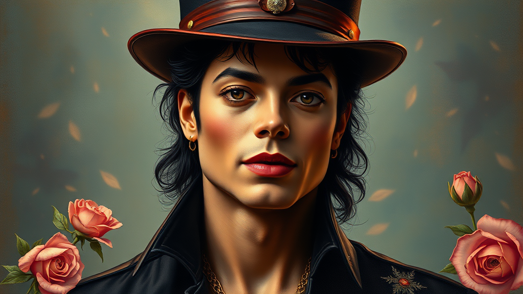Portrait of Michael Jackson, interpreted by the artistic fusion of Michael Whelan, Rossetti, Bouguereau, and Artgerm, capturing a retro and nostalgic essence with an old-fashioned flair, blending romantic and surreal elements with vibrant hints and a timeless aura.