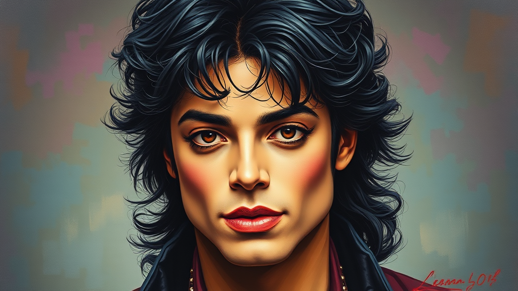 Portrait of Michael Jackson, painted in the style of Michael Whelan and inspired by the classic elegance of Rossetti and Bouguereau, blended with the dynamic touch of Artgerm. The artwork evokes a sense of retro nostalgia, capturing an old-fashioned charm with vibrant colors and intricate details, bringing to life the iconic essence of the 80s music legend in a timeless and imaginative way.