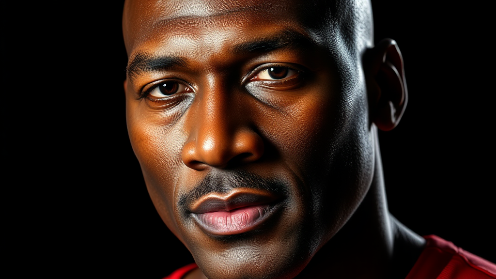 Portrait of Michael Jordan, captured in a high-resolution studio setting, illuminated with sophisticated studio lighting. The image showcases intricate detailing and sharp focus, rendering his facial features with extraordinary clarity. Set against a solid black background, this expertly color-graded photograph embraces an 8k octane rendering style, epitomizing the essence of professional commercial photography and crafted with a touch of creative flair.