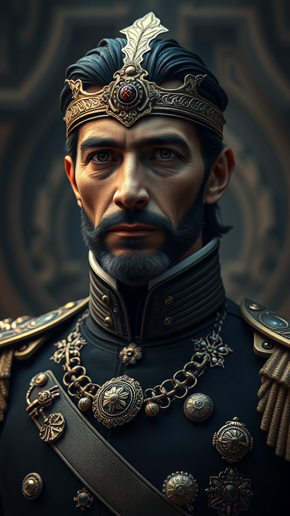 Portrait of Paul Atreides, Elegant, Royal Military Attire, Realistic, Highly Detailed, Ornate, Sci-Fi Theme, Ultra High Definition, HDR, 8K Resolution, Model: Dark Sushi Mix - Vibrant Colors, Inspired By Futuristic Vision, Avoiding Duplication, Perfectly Proportioned, Smooth Features, Clear Eyes, Balanced Expressions, Proportional Neck and Hands, Eliminating Imperfections, High-Quality Imagery, Well-Framed, Sharp, Free of Artifacts, No Watermarks or Text, Cropped with Precision, Emphasizing Realism and Consistency, Seamless and Masterfully Drawn.
