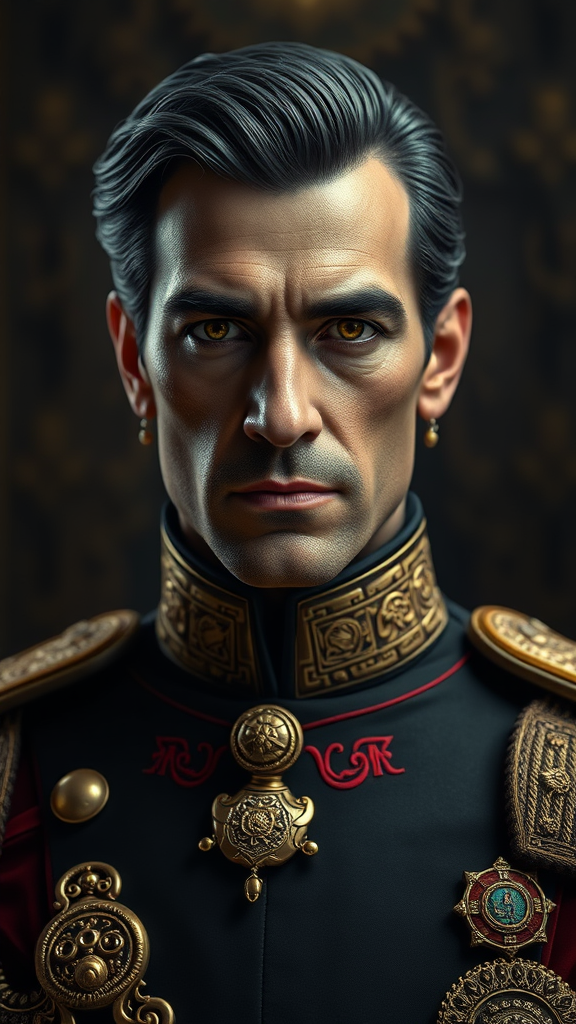 Portrait of Paul Atreides, Elegant, Royal Military Attire, Realistic, Detailed, Ornate, Futuristic Sci-Fi, High Definition, HDR, Ultra High Definition, 8K, Model: Dark Sushi Mix - Vibrant, Rendered by a Master, Graceful Composition, Opulent Details, Strong Expression, Enhanced Features, Natural Proportions, Captivating Eyes, Powerful Presence, Seamless Image, High-Quality Resolution, Clear and Sharp, Free of Distortion, Concentrated and Defined, Without Visual Imperfections, Cohesive and Unified Image, Exquisitely Crafted, Artistically Composed, No Distractions from Focus, Pure and Clear Aesthetic Experience.