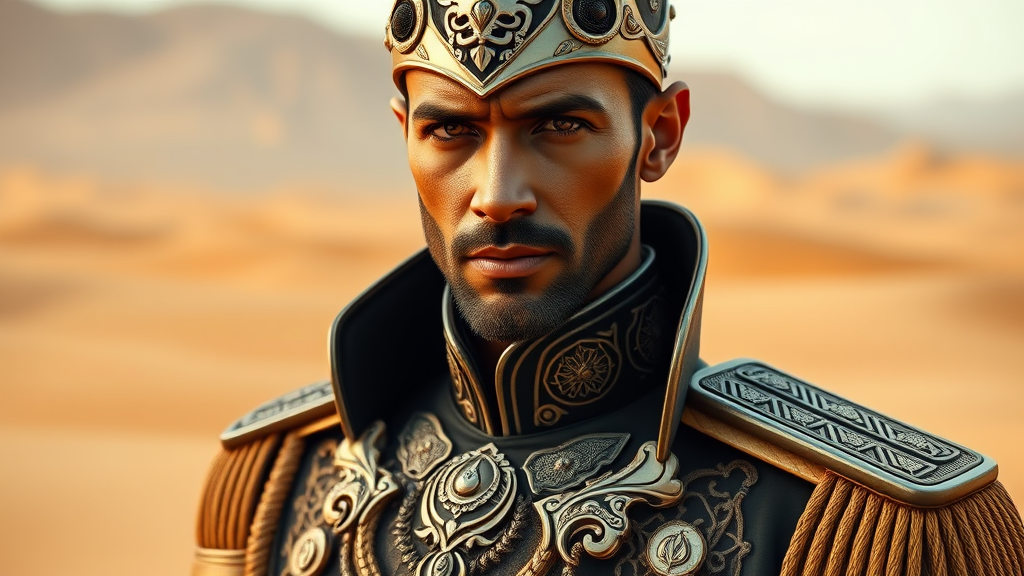 Portrait of Paul Atreides, Elegant, Royal Military Uniform, Realistic, Detailed, Ornate, Sci-Fi, UHD, HDR, 8K, Model: Dark Sushi Mix - Vivid, By Skilled Artist. Majestic and commanding presence, intricate embroidery, futuristic elements, high-definition clarity, sweeping desert backdrop, intense gaze, poised expression, precision detailing, seamless integration, immaculate composition, powerful lighting, balanced color palette, rich textures, harmonious aesthetics, coherent structure, refined proportions, evoking authority and mystery, unblemished, flawless execution.