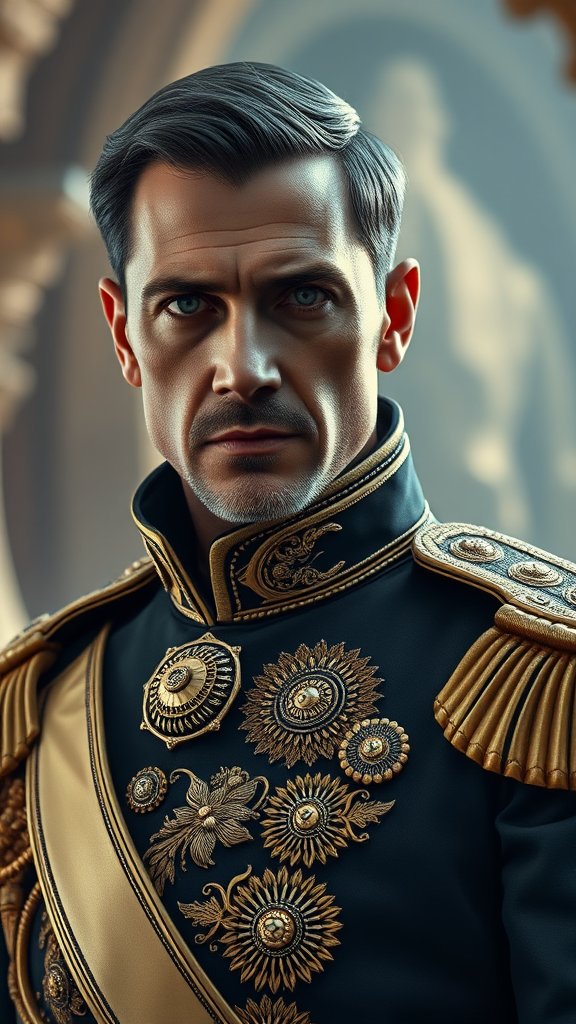 Portrait of Paul Atreides, Elegant, Royal Military Uniform, Realistic, Detailed, Ornate, Sci-Fi, UHD, HDR, 8K, Vibrant Color Palette, Cinematic Composition, Intricate Textures, Expressive Eyes, Regal Posture, Meticulous Craftsmanship, Futuristic Element, Sharp Focus, Smooth Features, Refined Aesthetics, Harmonious Design, Enhanced Definition, Exquisite Detailing, Polished Presentation, Elevated Imagery.