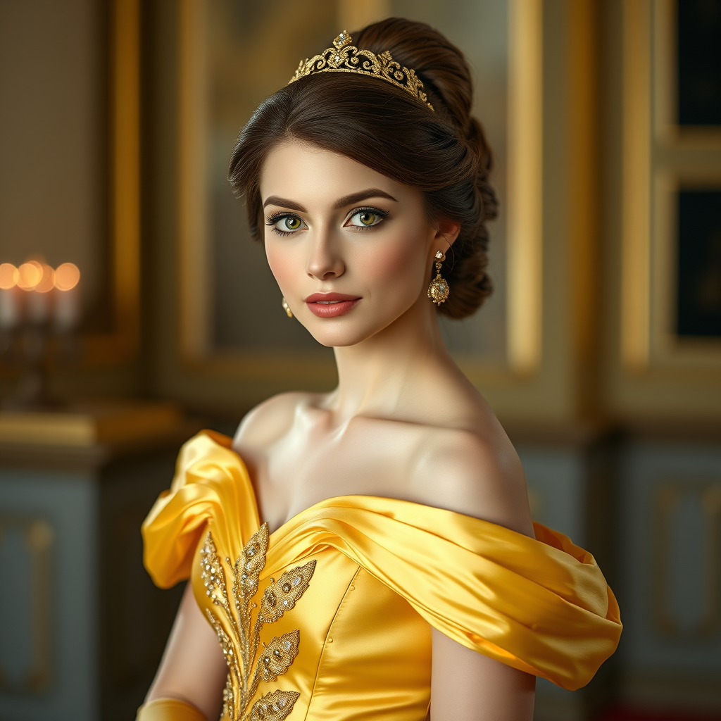Portrait of Princess Belle, elegant gold gown, intricate detail, 28-megapixel, ultra-high-resolution, 90-mm-lens, pristine focus, f:5.6, ISO 200, shutter-speed 1:100, gentle backlighting, acclaimed photograph, subtle catchlight, enhanced clarity, perfect symmetry, 8k resolution, captivating composition, aspect ratio 18:32, version 5.