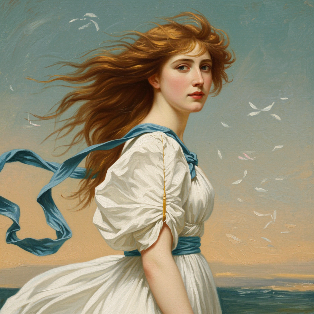 Portrait of Queen Aprilia, full-body view, long flowing hair swept by the wind, a blue ribbon elegantly draped on her shoulder, wearing a pristine white dress with voluminous sleeves and a graceful sash, capturing the essence of Jean-Léon Gérôme's classicism blended with the dynamic brushwork of John Singer Sargent, enriched with delicate textures and vibrant light play.