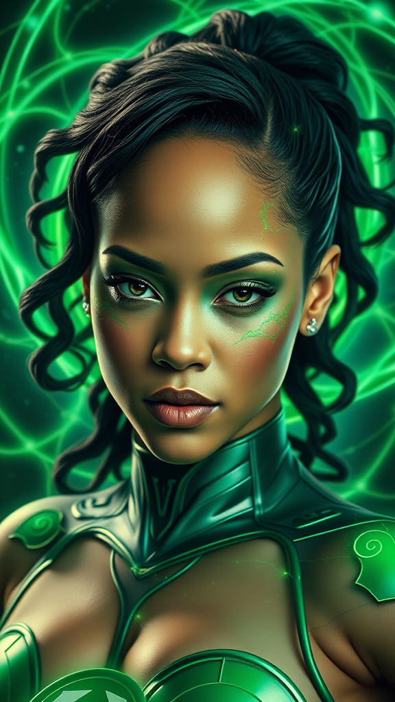 "Portrait of Rihanna as a powerful Green Lantern, youthful and vibrant, with intricate emerald energy patterns swirling around her, showcasing her strength and grace in hyperrealistic detail, captured in stunning 8k resolution, with a cosmic background hinting at interstellar adventures."