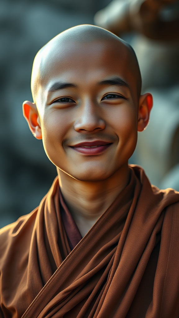 portrait of serene young monk with a gentle smile, realistic and radiant glow, captured in 8k with soft cinematic lighting, using 35mm f1.4 lens, fuji color film for a warm and natural tone, tranquil background that emphasizes peace, subtle modifications in expression to reflect inner harmony