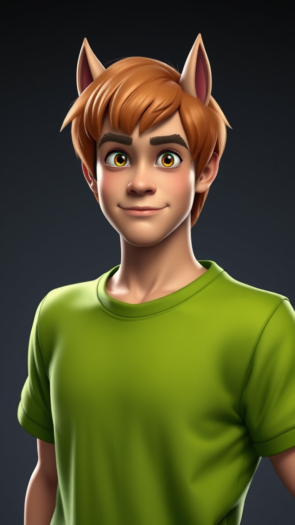 Portrait of Shaggy from Scooby Doo, wearing a green t-shirt, with light brown hair. Depicted as strong and confident with a sharp focus. Rendered in digital art style with a single subject in mind, offering concept art qualities. Enhanced with dynamic lighting, the image is ultra-detailed and polished, capturing the essence of Shaggy's character. The work infuses a modern twist on his classic appearance while staying true to the iconic Scooby Doo spirit.