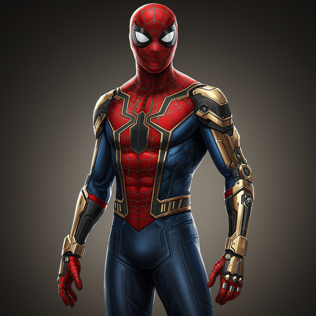 Portrait of Spider-Man in cybernetic heavy armor, featuring a sci-fi theme with intricate glowing elements; a full-body composition that is elegant and highly detailed, reminiscent of digital painting styles seen on ArtStation. It embodies concept art aesthetics with smooth rendering and sharp focus for an illustrative feel. This artwork is influenced by the styles of Artgerm, Greg Rutkowski, and Alphonse Mucha, and avoids elements such as text errors, low resolution, and quality issues. It also steers clear of visual flaws like duplicate or morbid features, deformed anatomy, and includes accurate proportions and well-defined limbs, free from any distracting artifacts or unsightly alterations.