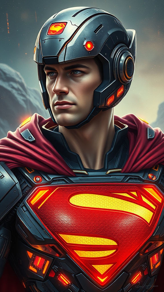 Portrait of Superman in advanced cybernetic armor and helmet, set in a sci-fi universe with glowing intricate details, full body depiction showcasing elegance, rendered in highly detailed digital painting style. Inspired by the artistry of Artgerm, Greg Rutkowski, and Alphonse Mucha, with attention to smoothness and sharp focus. The artwork embraces concept art aesthetics with an emphasis on a streamlined and precise illustration. Avoids elements like text errors, poor quality, or disfigured anatomy, ensuring a coherent and polished representation.