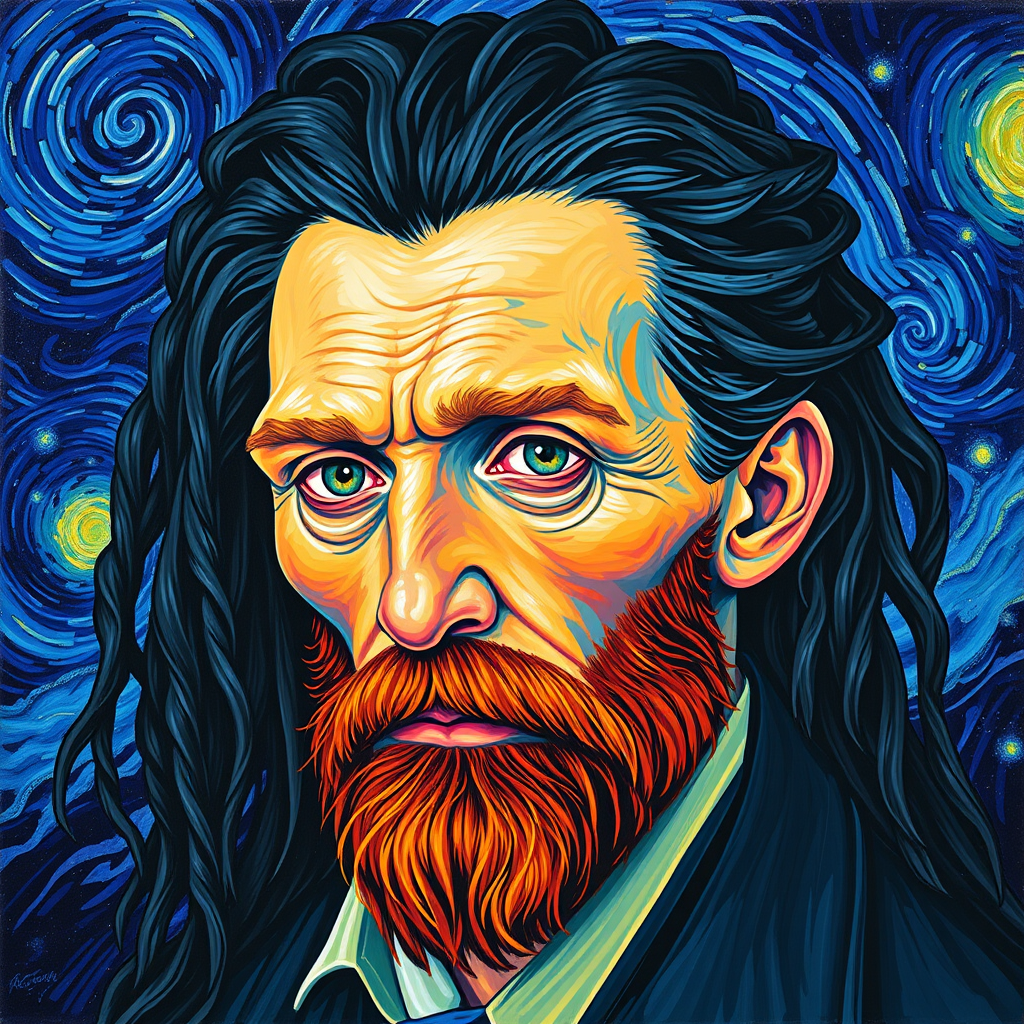 Portrait of Van Gogh with vibrant black dreadlocks, swirling brushstrokes enhancing the vivid colors, his intense gaze reflecting a fusion of classic and modern styles, set against a backdrop of starry night skies.