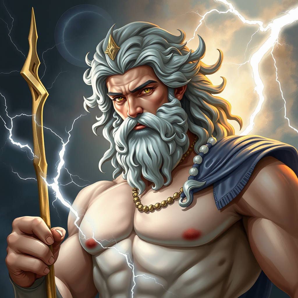 Portrait of Zeus, god of thunder, holding a lightning staff in one hand, showcasing a strong and muscular physique; fantasy-inspired with intricate and elegant details, digital painting style reminiscent of work by Gaston Bussiere and Alphonse Mucha, featuring smooth and sharp focus; high-quality illustration capturing the essence of classical mythology blended with modern art nuances, ensuring visual clarity and refined artistry without distortion or imperfections.