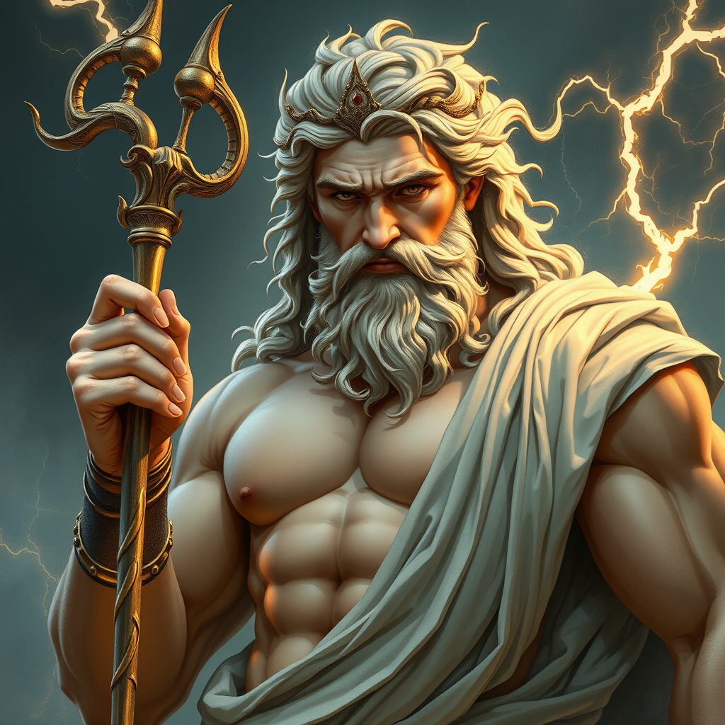 Portrait of Zeus, god of thunder, holding a lightning cane in one hand with a muscular build, rendered in a fantasy style with intricate and elegant details. This digital painting has sharp focus and presents a smooth, highly detailed illustration, inspired by the artistic styles of Gaston Bussiere and Alphonse Mucha. The artwork has subtle creative refinements while maintaining the core concept.