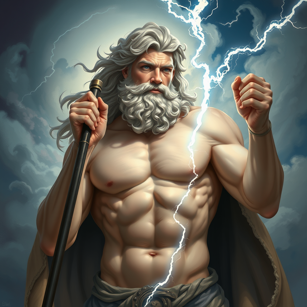 Portrait of Zeus, god of thunder, wielding a lightning cane, showcasing his muscular physique in an elegant and highly detailed fantasy style. This digital painting embodies the intricacy and sharp focus found in the works of Gaston Bussiere and Alphonse Mucha, blending smooth concept art with vibrant, imaginative elements. The divine portrayal captures Zeus's regal presence, accentuated with swirling storm clouds in the background, while ensuring technical precision in anatomy and proportions, avoiding common artistic pitfalls and maintaining a polished, captivating aesthetic free from any distortions or errors.