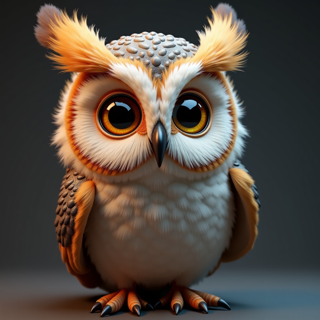 View this AI-generated image featuring a stunning 3d portrait of an adorable and fluffy owl featuring unique feathers with a shimmering metallic sheen complemented by large and expressive amber eyes rendered in exquisite 8k detail. Created using advanced AI technology, this image showcases character