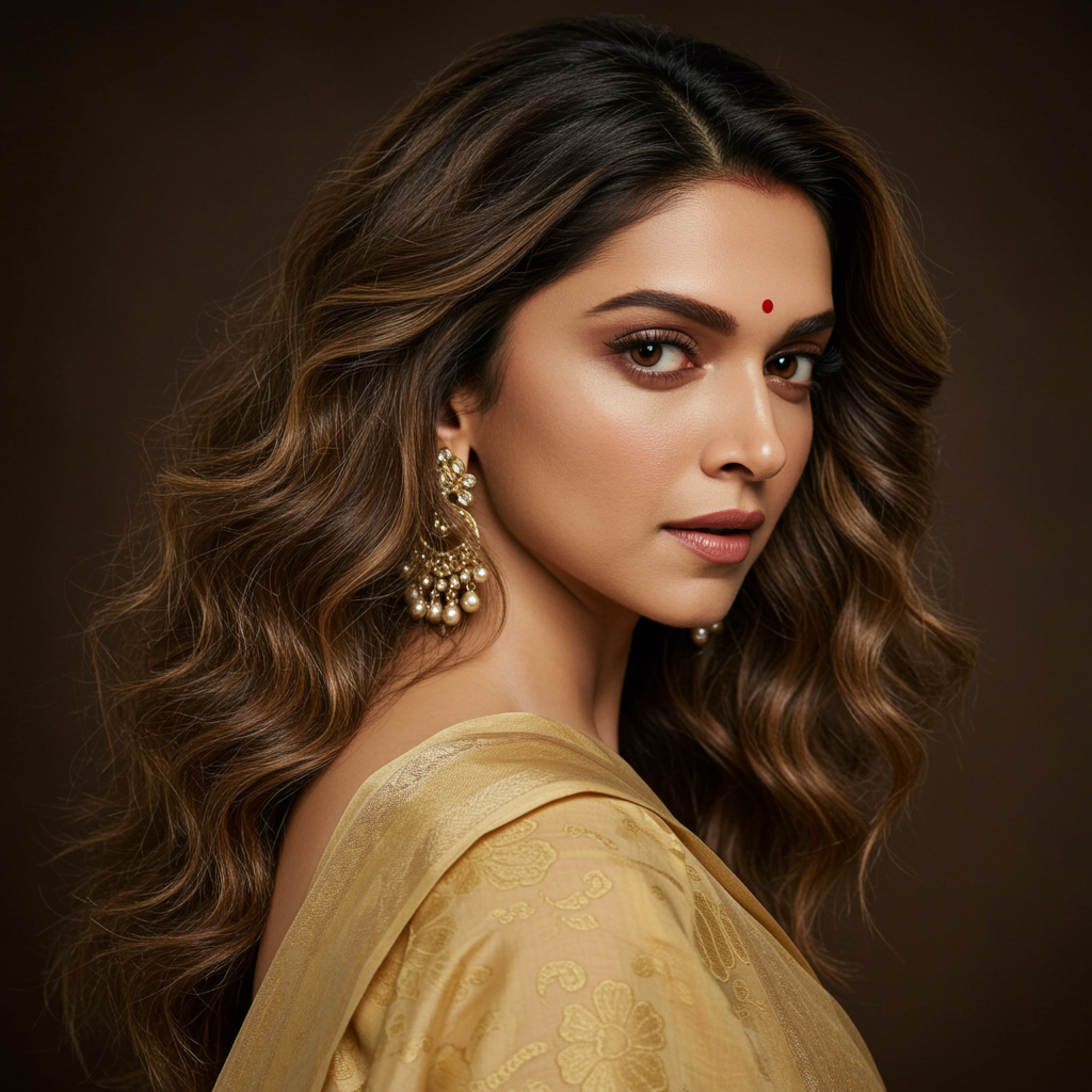 A breathtaking portrait of Deepika Padukone draped in a sari, viewed from a side angle. Her exquisitely detailed face captures the essence of Rembrandt’s style, blending realism with an ethereal quality. The portrait exudes a refined aesthetic sensibility, highlighting her playful femininity and unpolished authenticity. The depiction is ultra-realistic, showcasing expressive and meticulously detailed facial features. Her wavy, oshare kei hair in a light brown shade adds to the allure, maintaining the essence of the original vision with subtle creative nuances.