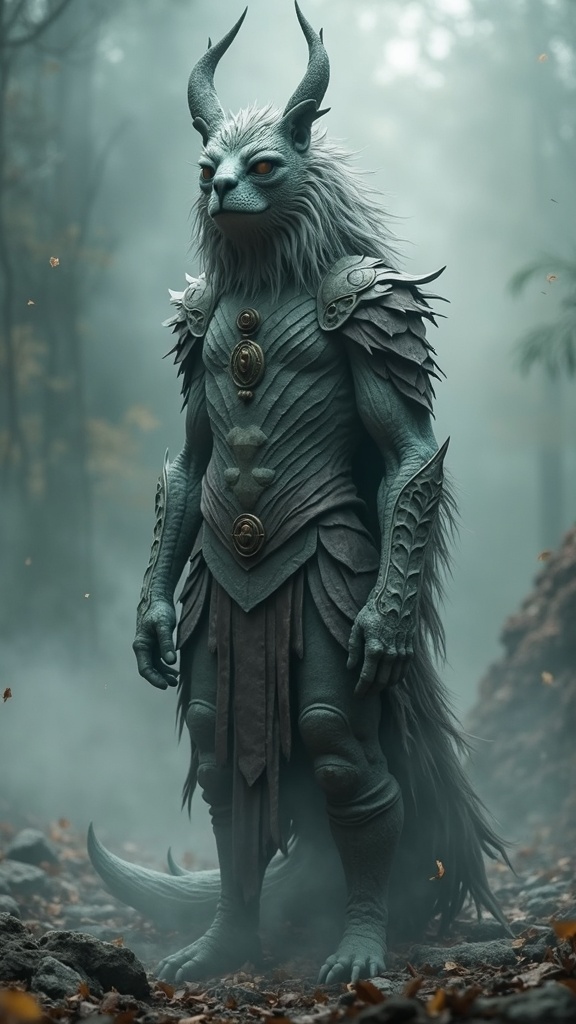 Portrait photo of a guardian creature, standing vigilant, signaling pause, step back, retrace steps, return, alert presence, cease, hold, directly facing forward, in sharp focus, enshrouded in ethereal mist, intricately detailed, perfect symmetry, imbued with an air of authority.
