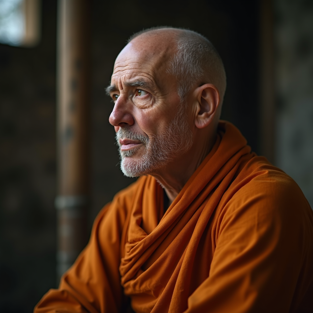 View this AI-generated image featuring portrait photo of a 58 year old monk gazing into the distance cinematic style captured with 50mm lens photography characterized by hard edge lighting wearing traditional orange robes inspired by the wisdom and spiritual presence of figures like rupert spira mah