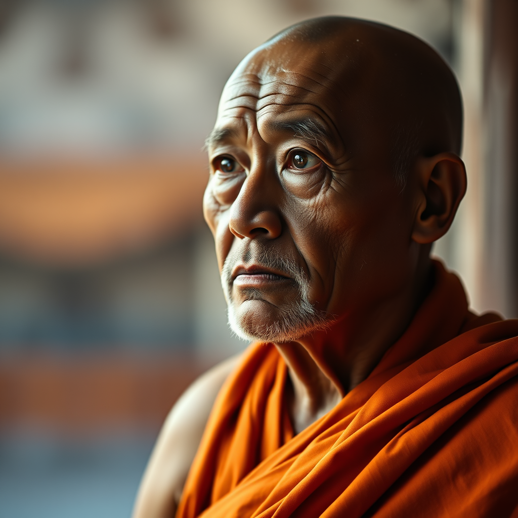 Portrait photo of a 58-year-old monk, gazing thoughtfully into the distance, cinematic style, captured with 50mm lens portrait photography, utilizing dramatic hard edge lighting, dressed in traditional orange robes, conveying a sense of wisdom and contemplation, featuring characteristics reminiscent of spiritual teachers like Rupert Spira, Maharshi, and Joan Tollifson, with serious, introspective eyes, embodying the essence of seasoned life experience and serenity in a portrait photograph.