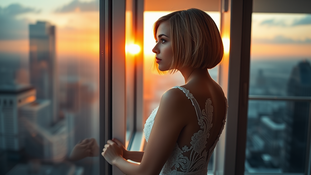 Portrait photo of a fashionable stunning girl gazing out a high-rise window, sporting a chic bob haircut, elegant white evening gown adorned with delicate lace, detailed and sophisticated design, 50mm, f/1.4 lens for clarity and precision, mid-body cowboy shot, enveloped in warm rim light from a setting sun, captured in 8K UHD, exuding a dreamy yet surreal atmosphere.