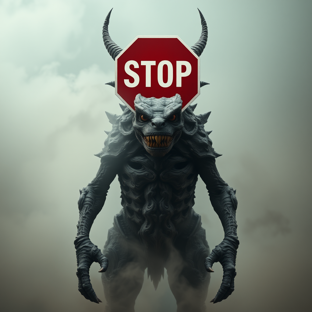 Portrait photo of a stop monster, standing still and commanding, a figure that suggests caution and pause, urging retreat and return, surrounded by swirling volumetric fog, with its expression a clear warning to halt and wait. The creature faces forward in sharp focus, every intricate detail captured with precision, exuding a sense of balance and symmetry. Slight creative nuances have been added, giving it an enigmatic and mesmerizing presence, enhancing its role as a guardian of passage.