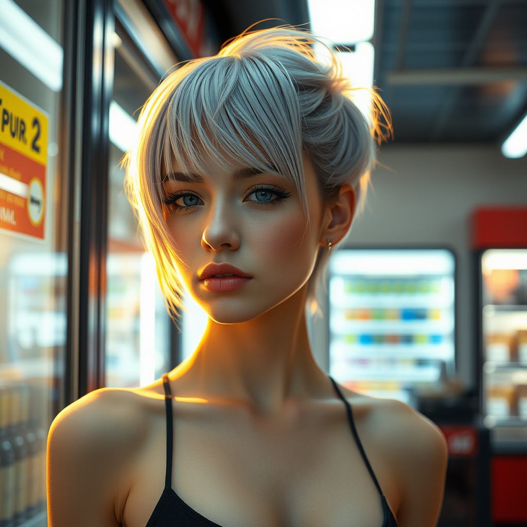 portrait photo of a stunning futuristic girl in a sleek convenience store, asymmetrical haircut, cyberpunk vibe, ethereal beauty, ultra-high definition, shot at 50mm, f/1.4, intricate detail, crisp focus, mid-shot, flawless posture, arms gently folded behind her, warm sunlight on her face, golden hour, beside a large window,