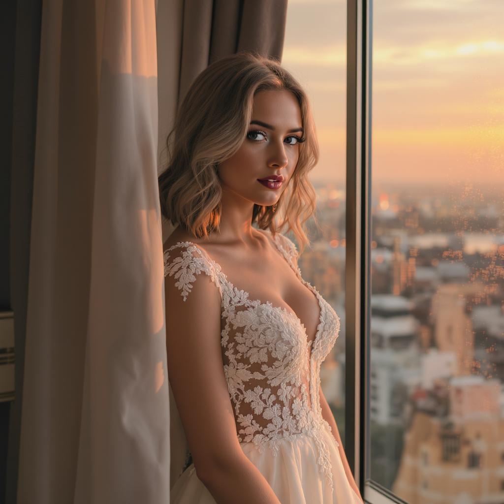 Portrait photo of a stylish young woman standing beside a high-rise window, with soft, wavy, shoulder-length hair, adorned in a stunning white evening gown featuring intricate lace details, captured with a 50mm lens at f/1.4 for high detail and sharp focus, framed in a cowboy shot style. The scene is accentuated with gentle rim lighting during a breathtaking sunset, rendering the visual in rich 8K UHD, infused with a dreamlike quality that evokes a sense of surreal beauty and ethereal elegance.