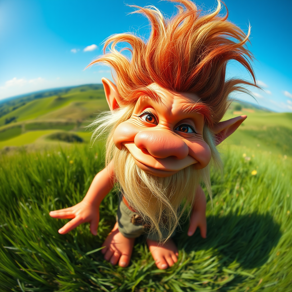 Portrait photo of a whimsical troll with exaggerated features, captured with a fisheye lens, standing in a lush, grassy meadow. Rolling hills stretch into the distance on a sunny day, with vivid and cheerful colors painting the landscape.