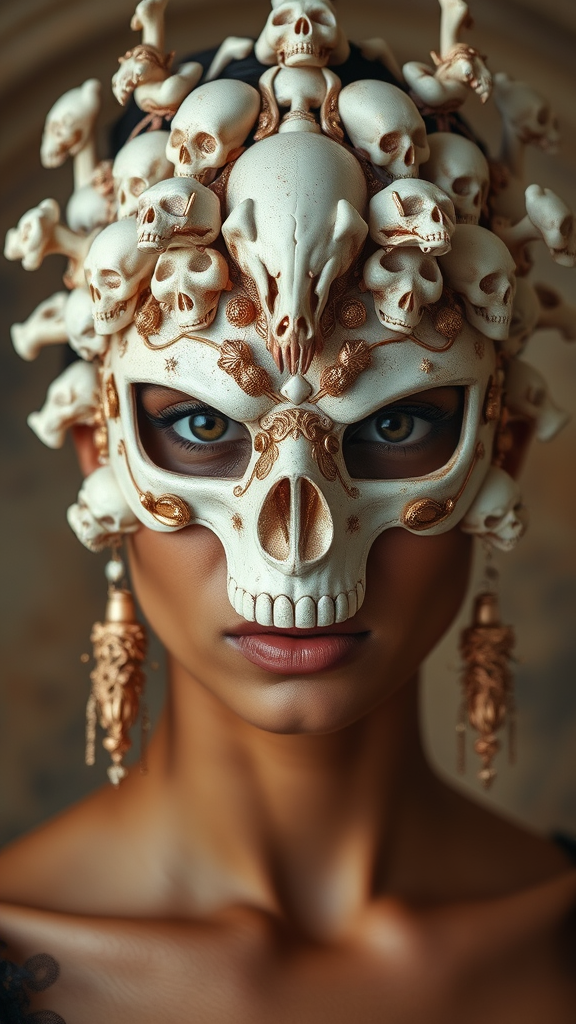 Portrait photo of a woman adorned with a mask crafted from skulls and bones in rose gold and white hues, gazing directly at the camera with a vogue-inspired frontal pose. The image exudes a sense of dreamy symbolism interwoven with celestialpunk elements, featuring intricate baroque-inspired details. Her tan skin complements the fashion-forward editorial aesthetic. Captured with a Canon 50mm f/1.2L lens, the portrait emphasizes ultra-fine details, maintaining a raw and stylized essence, version 6.0. The composition balances elegance and edginess with a hint of whimsy, inviting viewers into a mystical, otherworldly experience.