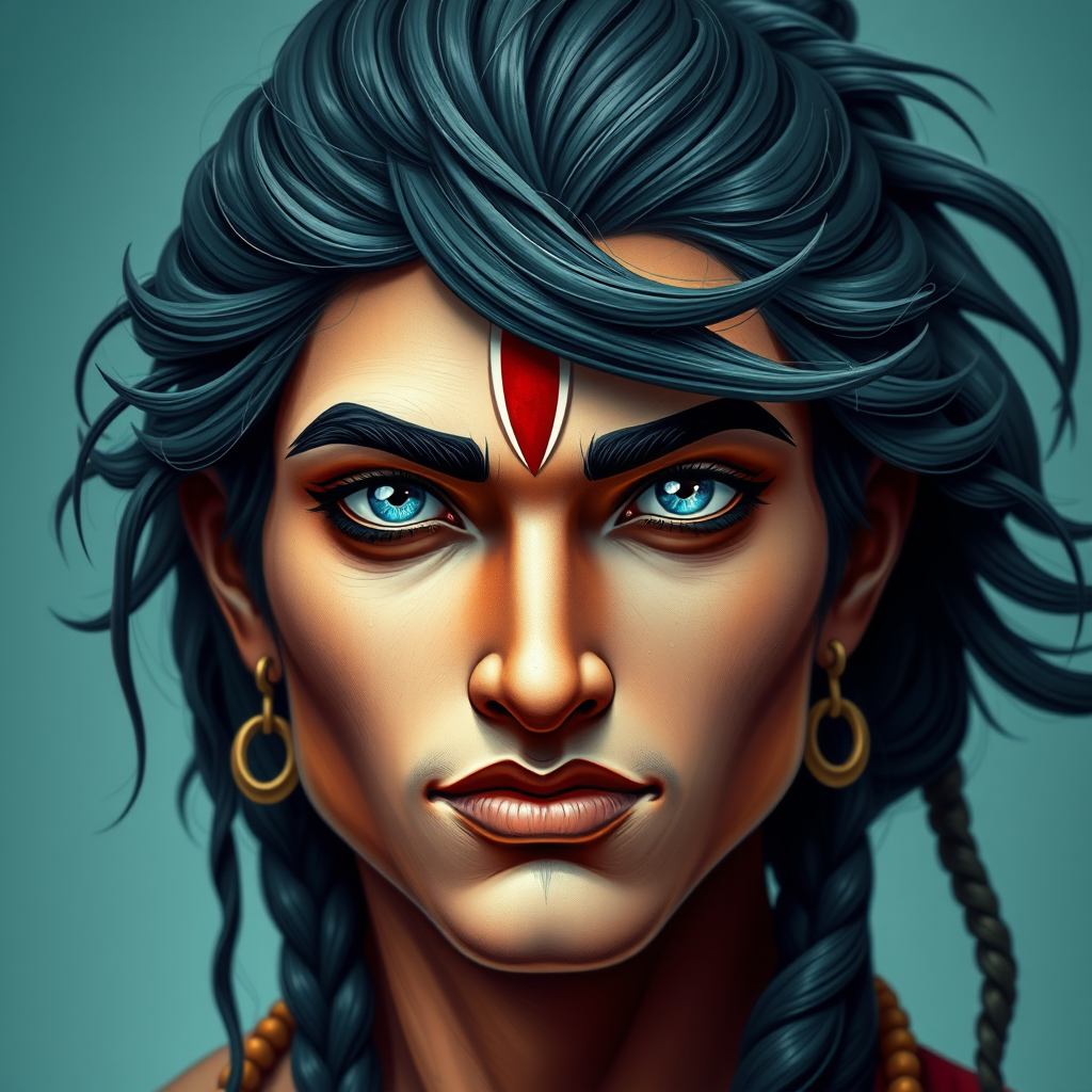 Portrait, photograph, androgynous hanuman, elegant oval jaw, refined features, captivating visage, braided hair, sweeping bangs, flowing ponytail, dazzling turquoise eyes, inspired by Hindu art.