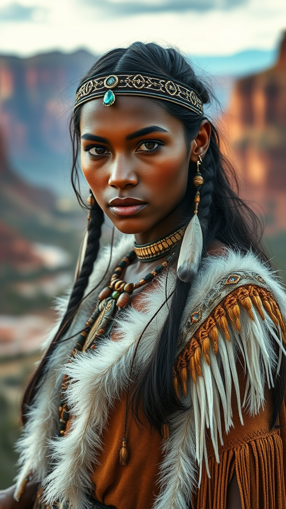 Portrait photograph in mdjrny-v4 style of Madison Beer as a reimagined Pocahontas: a young, beautiful Native American woman with a perfectly symmetrical face. She wears intricate feather jewelry and a traditional handmade dress, embodying the essence of an armed female hunter warrior. The setting is the breathtaking Utah landscape, captured in ultra-realistic detail with concept art influences from Artgerm, Greg Rutkowski, and Alphonse Mucha. Her dark complexion is complemented by accents of white fur and gold fabric. The image features a captivating depth of field, is rendered in 8k, and highlights a single figure, emphasizing elegance and strength while avoiding any elements of distortion or multiple characters.
