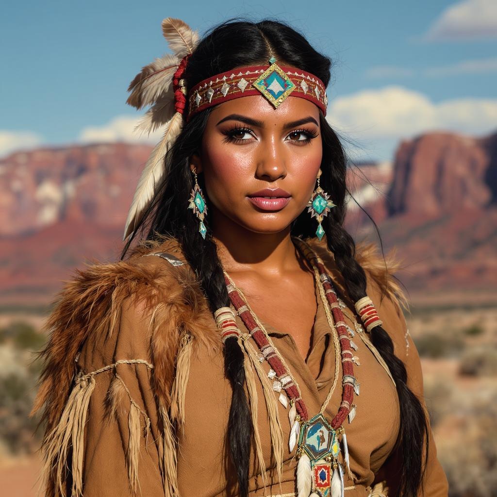 Portrait photograph of a young beautiful Native American woman inspired by Madison Beer as Pocahontas, featuring a perfect symmetrical face adorned with feather jewelry and wearing a traditional handmade dress. She embodies the essence of a skilled female warrior hunter, set against a stunning Utah landscape. The image is ultra-realistic, concept art-style, with an elegant touch and depth of field, capturing the natural beauty and strength of the character.