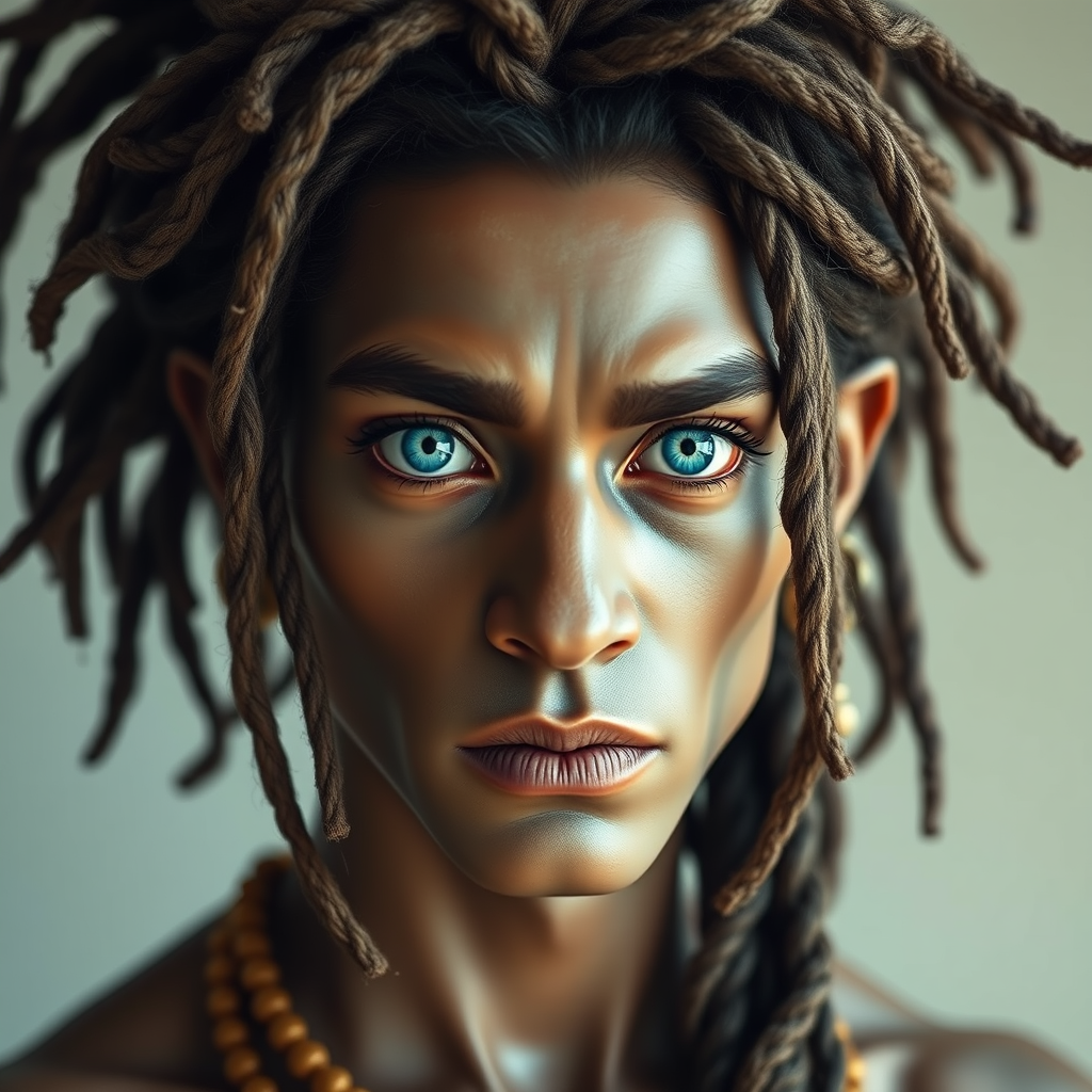Portrait photograph of an androgynous Hanuman, with an oval jaw and delicate features, a captivatingly beautiful face. The figure has dreadlocked hair with long bangs and a flowing ponytail. Their bright blue-green eyes are enchanting, framed in a style reminiscent of Hindu art.