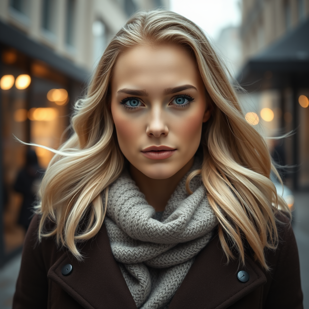 Portrait photograph of Gal Gadot in winter attire, with flowing blonde hair and delicate freckles, showcasing her beautiful symmetrical face with subtle, natural makeup. The setting is a modern upscale urban environment, captured in an ultra-realistic style. The shot is elegant, highly detailed, with sharp focus and designed for depth of field at f/1.8 using an 85mm lens, featuring a medium shot. Volumetric fog adds to the atmosphere, making it visually compelling and suitable for platforms like Instagram and Tumblr in HDR 4k, 8k resolution. The image maintains a cinematic, realistic feel.