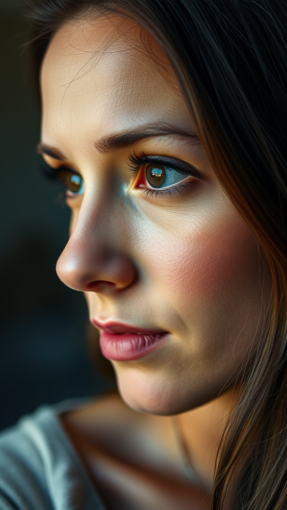 Portrait Photography, A highly detailed close-up of a serene woman gazing thoughtfully to the left, her eyes are bright and filled with an engaging expression that contrasts subtly against a softly blurred background, Her skin appears smooth and radiant, An exceptional capture that highlights her eye color in a vivid manner, Employ an 85mm lens with an ISO of 400 to achieve precise focus on her unique facial features, Shutter speed set at 1/500, and aperture at f/1.8 to emphasize her eyes and hair with a narrow depth of field, aiming for a realistic, high-resolution image with slight artistic variations, yet retaining the essence of vivid detail and striking clarity.