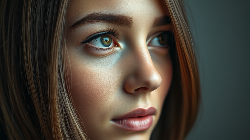 Portrait Photography, A highly detailed close-up of a serene woman gazing to the left, with captivating, bright eyes that shine with intensity and create a striking contrast against a subdued backdrop, Her skin is impeccably smooth and radiant, A prize-worthy capture that highlights her eye color with remarkable clarity, Utilize an 85mm lens with ISO 400 to achieve precise focus on her distinct facial features, Shutter speed set at 1/500 and an aperture of f/1.8 to bring out her eyes and hair in dramatic relief with a shallow depth of field, aiming for an ultra-realistic, high-resolution image. Add subtle creative touches to enhance the composition while preserving the essence of the scene.