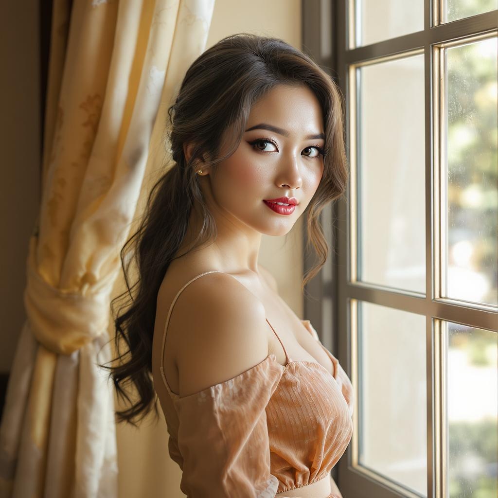 Portrait photography of a stunning woman posing in front of a window, captured with an 80mm lens at f22, exhibiting high detail and sharp focus. The image is trending on ArtStation and Pixiv, featuring an 8k UHD resolution taken with a DSLR. The photograph displays intricate details and soft lighting, ensuring high quality with an aesthetic appeal. The close-up is carefully cropped, emphasizing the beauty and expression of the subject. The composition excludes any physical anomalies or distortions, maintaining perfect anatomy and proportions, with a natural and elegant appearance.