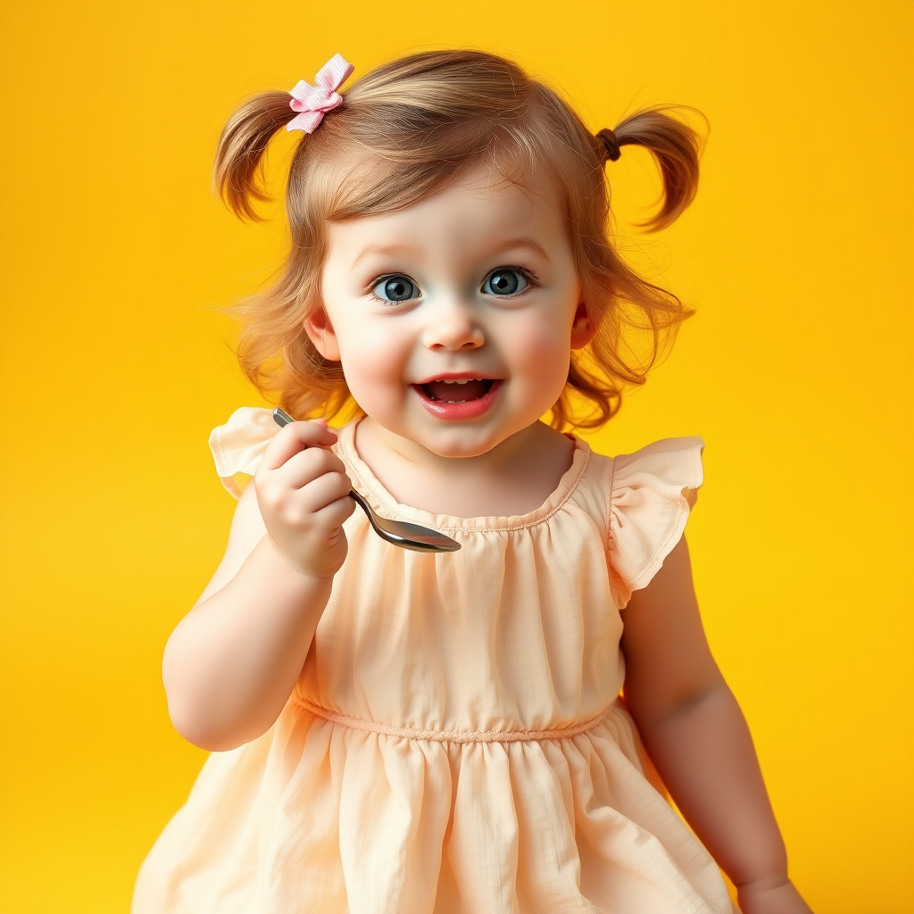 Portrait photography of an adorable 3-year-old British toddler girl in a soft pastel dress, playfully holding a spoon on a bright yellow backdrop, with an amused and curious expression, captured in a professional studio setting.