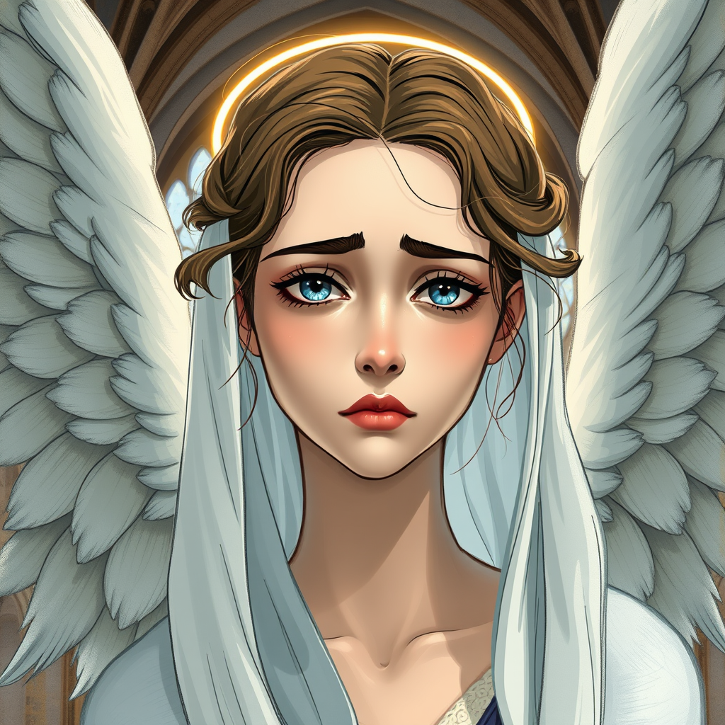 Portrait, realistic depiction of an angel with a deeply sad facial expression, halo of light around head, inspired by painting style of Alexandre Cabanel, featuring blue eyes, a flowing veil, set against a backdrop of an old cathedral, with soft, ethereal lighting. The artwork incorporates elements of 3D, cartoon, and anime styles, emphasizing a blend of sketch-like qualities. The composition maintains a focus on beautiful, harmonious anatomy, avoiding exaggeration or deformation, capturing an essence of glorious art.