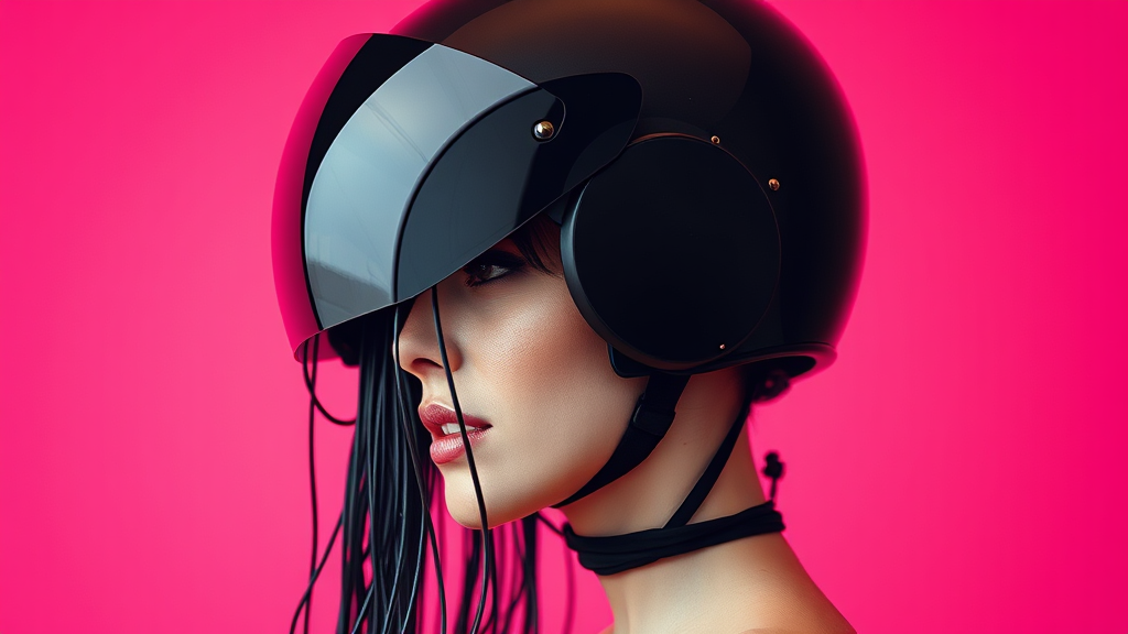 Portrait showcasing a striking contrast, capturing a side profile silhouette of a woman. She dons a sleek, glossy black helmet that conceals her eyes, adorned with intricate details of long, flowing cables, wires, and metallic tubes cascading down, mimicking the look of slick, wet, black hair. Her face is pale and delicate, exhibiting a serene expression with soft pink lips, partially hidden by the elaborate headgear. Set against a vibrant hot pink background, the composition employs a camera setup that mimics a large aperture, sharply focusing on the silhouette's edge, while a low ISO ensures the vibrancy of the colors remains rich and free from grain, photorealistic and in ultra-high definition, with a subtle artistic twist, maintaining the core essence of the concept.