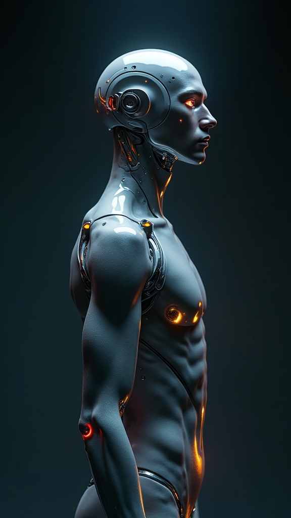 A striking portrait of a sleek, silver-hued male cyborg with a futuristic and polished design, his eyes replaced by advanced holographic visors emitting a soft glow, standing out against a shadowy backdrop. The metallic surface of the cyborg reflects hints of ambient light, creating an ethereal and otherworldly presence as he appears to levitate, suspended effortlessly in the darkened environment. Subtle neon accents add a layer of modernity to his form, enhancing the overall aura of advanced technology and surreal elegance.