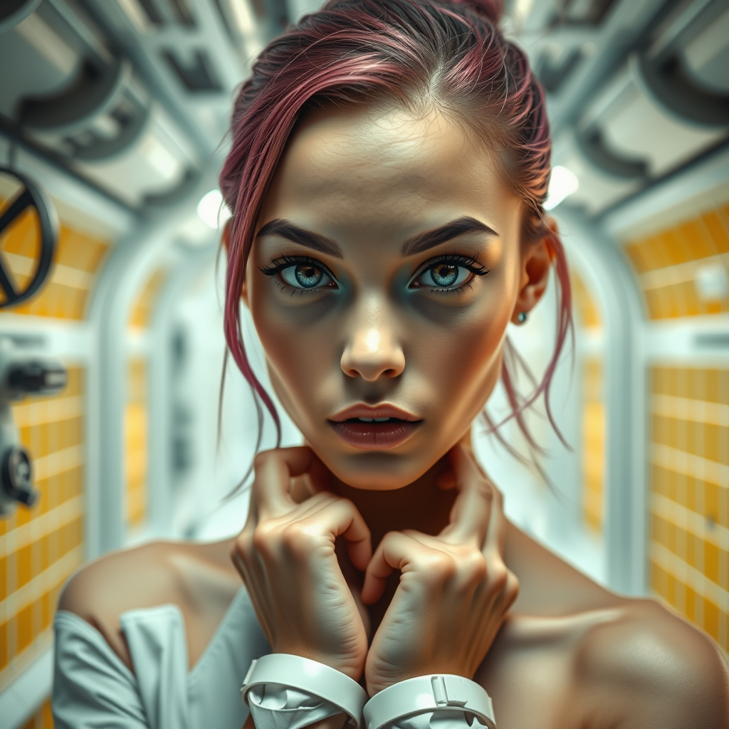 Portrait, striking eyes, captivating face, innocent and naive expression, stunningly beautiful slender young woman, alluring pose, set in a futuristic sci-fi environment, woman detained, hands cuffed, colorful hair, woman gazing at the camera, situated in a futuristic white laboratory with mustard-colored grids, sci-fi lab apparatus, exceptional quality, ultra-high definition, photorealistic, hyper-realistic, inspired by Rembrandt lighting, avoid child-like features, ensure accurate anatomy, single face and body structure, elegant proportion, clarity ensured, no visual distortion, vibrant yet balanced colors, maintain natural looking hands and limbs, ensure a singular, cohesive appearance, no duplication or disfigurement, emphasize natural beauty and poise within a clean, high-tech aesthetic environment.