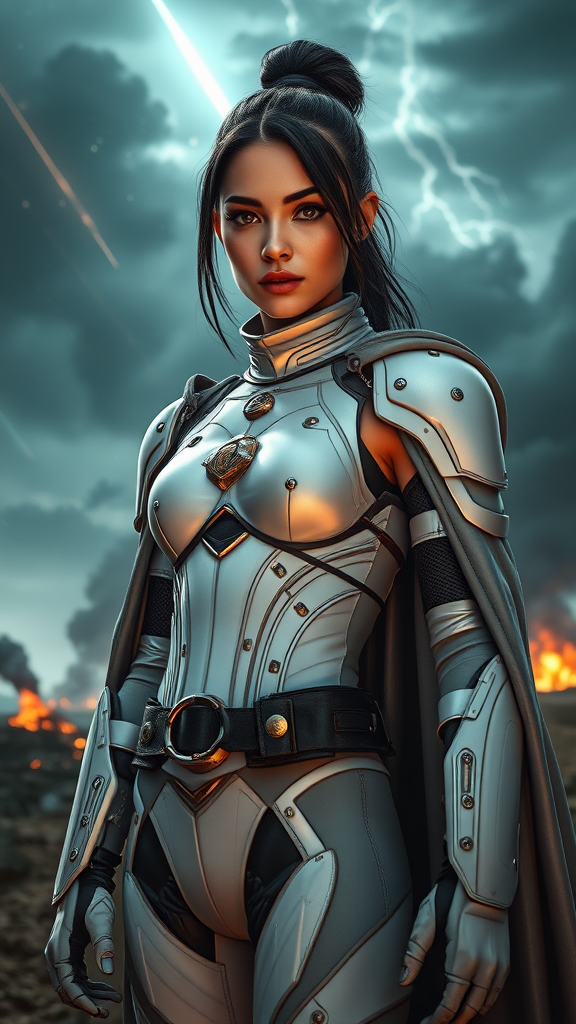 Portrait three-quarter close-up of a stunningly beautiful young woman with a slender athletic figure and an aristocratic face, exhibiting an expression that is both arrogant and innocent. She is adorned in sci-fi battle armor reminiscent of Ghost In The Shell, featuring a tight white jumpsuit with armored leggings and a dense cloak. The backdrop includes a dramatic scene of a meteor shower, black smoke from distant fires, and looming thunderclouds, creating a gloomy and intense atmosphere. Captured from a low angle with a Canon EOS 5D Mark IV, the image boasts hyper-realistic detail, enhanced by natural reflections and cinematic lighting. Elements such as a bright, almost blinding light accentuate her appearance, along with a gold corset with rivets, highlighting symmetry and balance. The scene avoids any distorted or unnatural features, maintaining clarity and proportion throughout, ensuring a clean and high-quality visual without imperfections or extraneous elements.