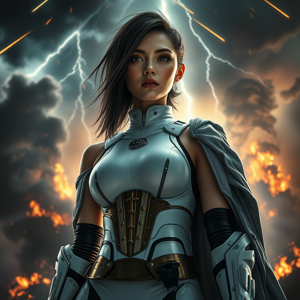 portrait three-quarter close-up stunningly beautiful young woman slender athletic figure aristocratic face with a mix of arrogance and innocence in her expression hair styled in a futuristic manner sci-fi battle armor mech inspired by Ghost In The Shell wearing a tight white jumpsuit with armored leggings and a dense cloak amidst a meteor shower with black smoke rising from fires under thunderclouds reflections of fires create a dramatic expressive background with a crushing atmosphere frame from below captured with a Canon EOS 5D Mark IV DSLR at f/8 aperture 1/250 second shutter speed ISO 100 super detailed hyperphotorealism showcasing natural reflections and textures while cinematic lighting casts stained patterns bright light accentuates features like a gold corset and riveting complementing symmetry with bare arms neck and chest ensuring an otherworldly yet humanistic allure
