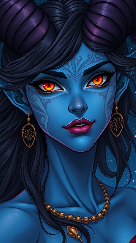 A striking portrait of a female tiefling with vivid azure skin, her face adorned with intricate patterns that evoke a mystical aura. Her lush, spiraling horns curve gracefully, complementing her fiery amber eyes that hint at a mischievous yet wise nature. Her expression is both enchanting and enigmatic, capturing the essence of a demon girl rooted in both elegance and power. She stands against a cosmic backdrop, reminiscent of starry realms, accentuating her ethereal presence. This depiction, painted in an art style inspired by "Arcane," blends anime influences with the classic D&D cosmology, imbuing her with both fierceness and allure. Her flowing hair, dark as a starlit night, frames her face with an untamed grace, completing the image of this captivating cosmic demoness.